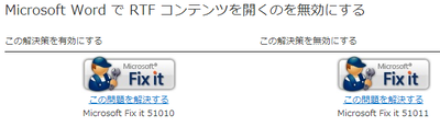 緊急:Wordと特にOutlookが今危ない!今すぐ対処を! ※2014年3月25日現在。 2014年3月28日マイクロソフトのサイト日本語化に伴い、修正。 2014/03/25 15:50 『マイクロソフト セキュリティ アドバイザリ(2953095)』 http://technet.microsoft.com/ja-jp/security/advisory/2953095 の日本語版が公開されました。 → 『マイクロソフト セキュリティ アドバイザリー(2953095)』 マイクロソフトのWord及びOutlookで、 『RTF(書式などの入ったリッチ・テキスト・ファイル)形式の電子メール』を開いた時に、 リモートでコードが実行される可能性があります。 ※Word及びOutlookのバージョンは、事実上全てのバージョンです。 今回のは、ユーザー権限を取得する!とんでもないウィルスです。 ※ネットを通じて、あなたのパソコンを自由に操作できる、ということ。 しかも、悪いことに、Outlookでは、 規定のビューアーがWordに設定されているため、 その電子メールを、 『単に、Outlookでプレビューしただけでも、 リモートでコードが実行される』可能性があることです。 Outlookのオプションで、テキスト形式で電子メールを読むオプションをしている場合は別ですが、 これは、まれでしょう。 いずれはWindowsのUpdateで処理されるはずですが、すぐには対処できないようで、 この場限りの、あとで元に戻さなければならない、対処策だけが公開されています。 上記のページには、私がここで解説した内容の詳細が書かれています。 非常にわかりにくいと思いますので、付け加えると、 実際にどうすればよいかは、 英語で、次のページに記載されています。 『Microsoft security advisory: Vulnerability in Microsoft Word could allow remote code execution』 → https://support.microsoft.com/kb/2953095/ja ※2014年3月28日、日本語化に伴い修正。 『マイクロソフト セキュリティ アドバイザリー:Microsoft Wordの脆弱性により、リモートでコードが実行される』 https://support.microsoft.com/kb/2953095/ja → 『マイクロソフト セキュリティ アドバイザリー:Microsoft Wordの脆弱性により、リモートでコードが実行される』 要は、WordでRTF形式の文書を読めなくするソフトと、 これを解除するソフトを用意したから、 1.とりあえずは、読めないようにしてくれ。 2.Windows Updateで対応できるようになったら、解除してくれ、 ということです。 それらのソフトは、同ページにあリます。 参考までに図示すると、 ※2014年3月28日、サイトの日本語化に伴い、画像を交換しました。 どちらも『Fix it』というソフトで、 左の51010がRTF文書を読めなくするソフト、右の51011が解除するソフトです。 実際に、同ページヘ移動してもらって、 Outlookを電子メールソフトとして利用している人は、 面倒でも『Fix it』を、利用してください。 英語ですが、ウィザードに従えば、簡単にインストールできると思います。 ≪注意≫ RTF形式の文書を読めなくするソフトを使った場合、 後から、必ず解除するソフトを利用してください。 ※Windows Updateで、対処できるようになった時。 私は、Outlookを使用していますが、Gmailと2重に設定しているので、 当分Outlookの使用を差し控えるつもりです。 Wordへの攻撃はこれからも続くと予想されます。 もし、あなたがOutlookを利用しているのなら、 この機会に私のようにメールソフトの2重化をオススメします。 そうすれば、今回のような緊急事態に対処可能です。 候補は、GmailやMozillaのThunderbirdでしょうか。 ※以前私は、Thunderbirdで2重化していましたが、大量のメールでは遅すぎるので、 GmailとOutlookに切り替えました。 (かなり時間がかかりましたが、PCを利用していない時間を使えば、大丈夫) 最後までお読み下さり、ありがとうございました。 PR