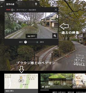 Googleストリートビューで過去の映像を見られる!期間限定でペグマンがブラウン博士に! Googleストリートビューでは、2014年4月24日より、 過去の風景や町並みを見られるようになりました。 「タイムマシン機能」と言います。 場所によって、指定できる時期はかなり異なりますが、 ストリートビューを開いた時に、画面の左上に小さな画面が出ていれば、 スライダーで指定することで、過去の映像が表示されます。 例えば、次は、京都の哲学の道の風景です。 左上の小さな画面では、2011年の4月の頃の画像が表示されています。 桜の花が開いていますね。 指定した過去の画面をクリックすると、 ストリートビューが過去の映像に変わります。 なお、画面左下のペグマンが、期間限定で、 映画「バック・トゥー・ザ・フューチャー」のエメット ブラウン博士になっています。 言われてみればそうかな?と思いますが・・・ 限定の期間は、公開されていないようなので、 いつまでみられるかわかりません。 興味があれば、ご覧ください。 ※ご自身でストリートビューを使って実際に体験したい人は、 下記にアドレスを表示していますので、 コピーして、アドレスバーに貼り付け、移動してください。 https://www.google.co.jp/maps/@35.022835,135.795467,3a,75y,226.75h,82.7t/data=!3m4!1e1!3m2!1s6tPUfICN_L4vp2bChmRf8A!2e0 ところで、Googleでは、「未来へのキオク」を公開しています。 これは、東日本大震災で被災した地域の2008 年~ 2009 年にかけて撮影した、 震災前の画像によるストリートビューですが、 これも、タイムマシンの表示対象となりました。 詳しくは、Googleの公式ページ 「ストリートビューで時間旅行」をご覧ください。 PR